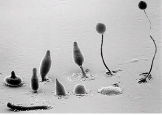The slug-like aggregate organism releases a layer of slime on which it glides. The slime trail is in part responsible for Dictyostelium's common name “slime mold.” When the movement stops, the cells differentiate and form a stalk structure with a round spore case on top. When many slugs form the stalk structure the mass looks like a mold. Each of the spores contains a living cell which, when it falls onto a suitable surface, will open and new amoeba will emerge and initiate another life cycle.